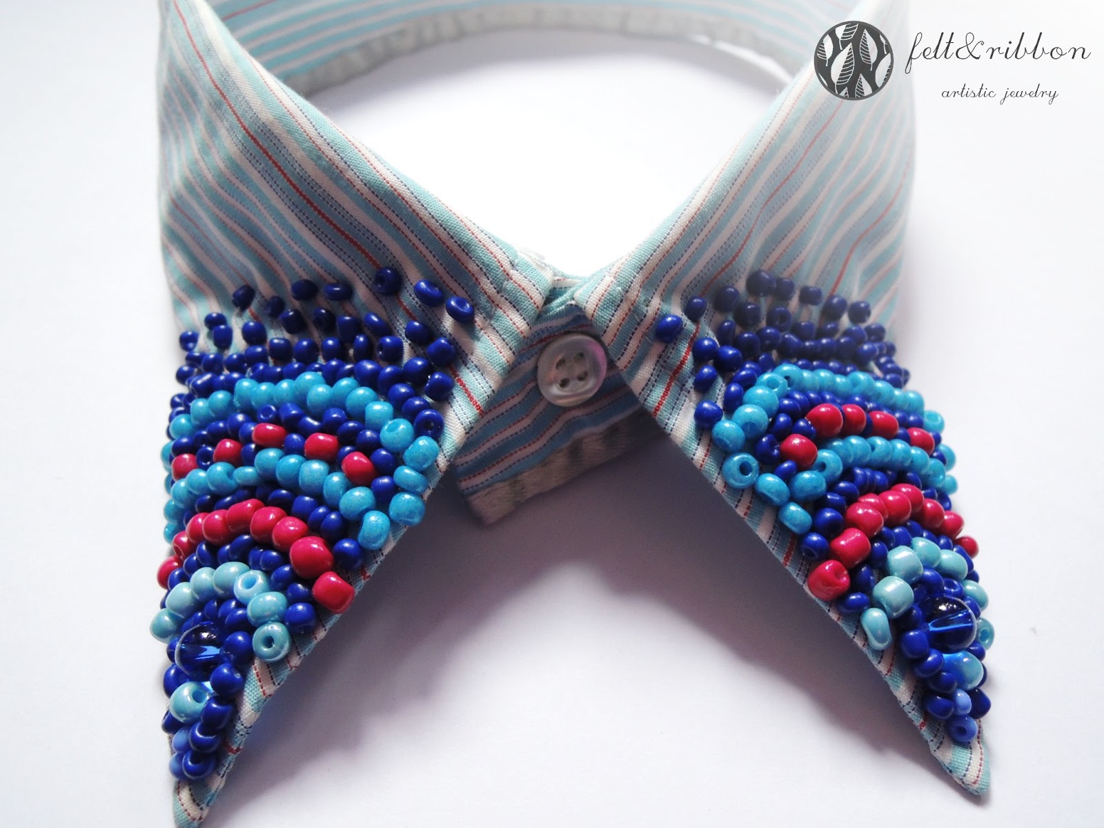 Obiecałam wstawić kilka zdjęć nowego kołnierzyka. Skończyłam go wczoraj. Niebieskie i różowe koraliki pasowały idealnie. Spójrzcie na zdjęcia, jak taka mała rzecz może odmienić zwyczajny, prosty strój. Wyobraź sobie jak nudno wyglądałabym bez kołnierzyka. Jest perfekcyjny do prostych strojów i robi różnicę - to pewne. Mam kilka kołnierzyków więcej to zrobienia w przyszłości. Stare koszule zostały przecież po coś zniszczone. Powinny służyć dalej! Czekam na nowe pomysły w mojej głowie, żeby zrobić je ciekawie i z klasą.