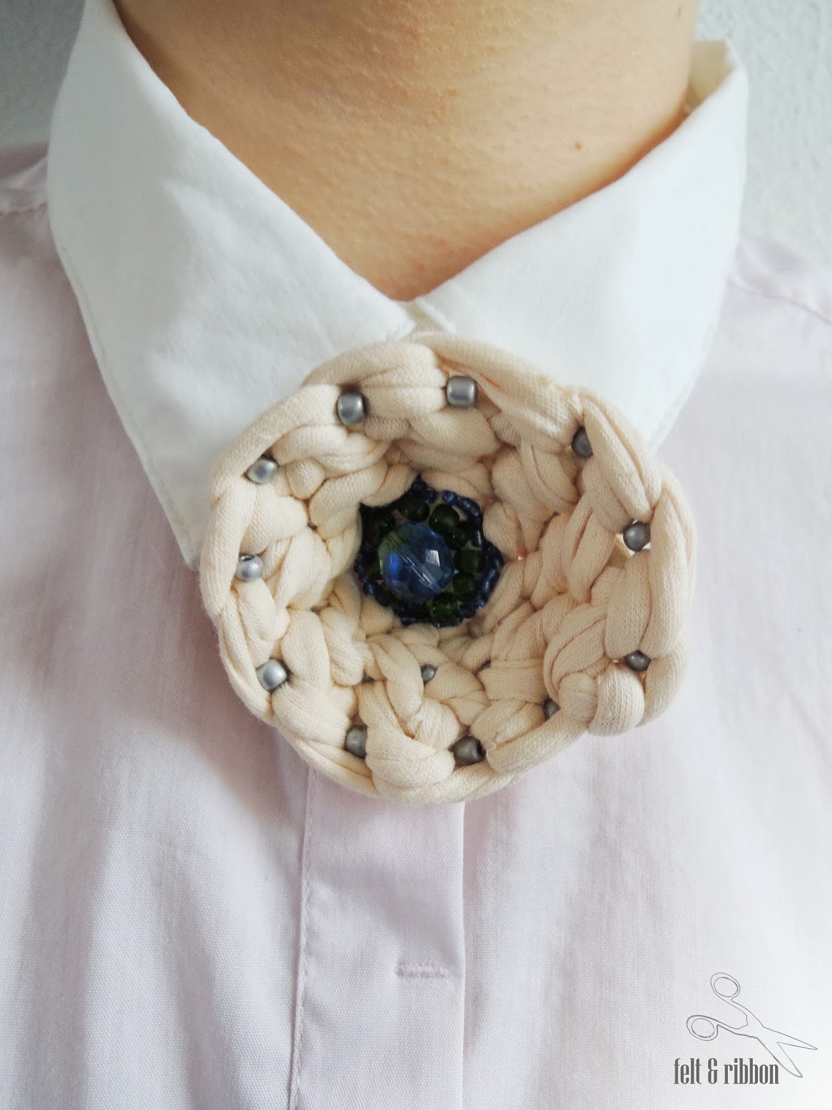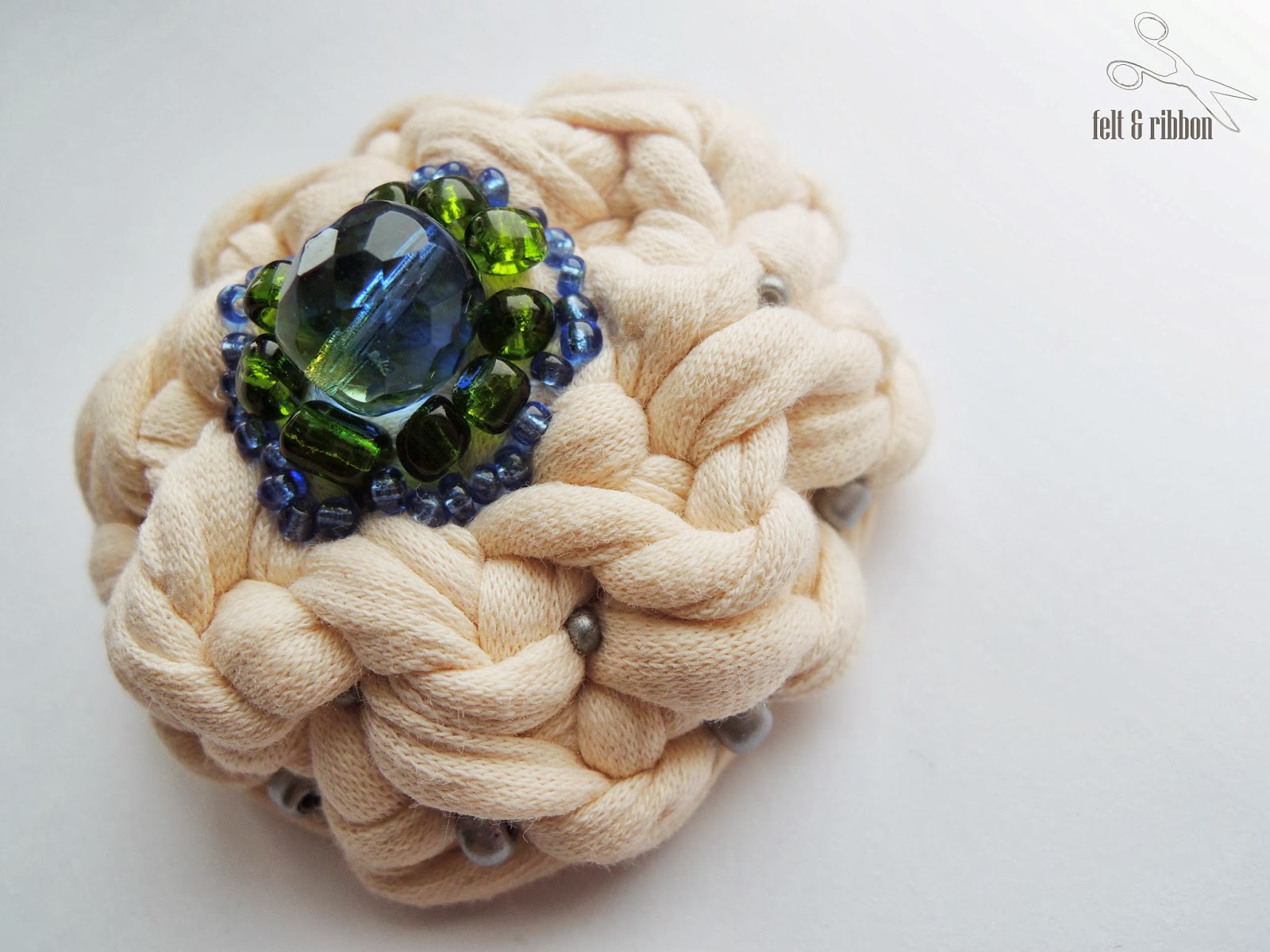 Today I want to show you another crochet brooch. This time in beige, with blue, green and silver beads. It can be worn in two ways: convex or concave.