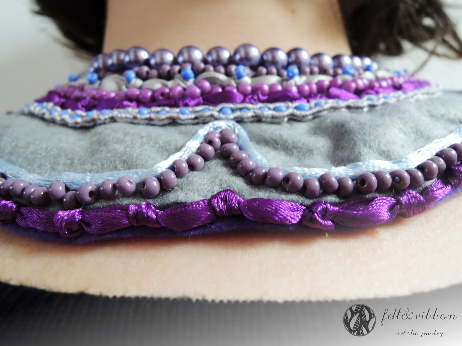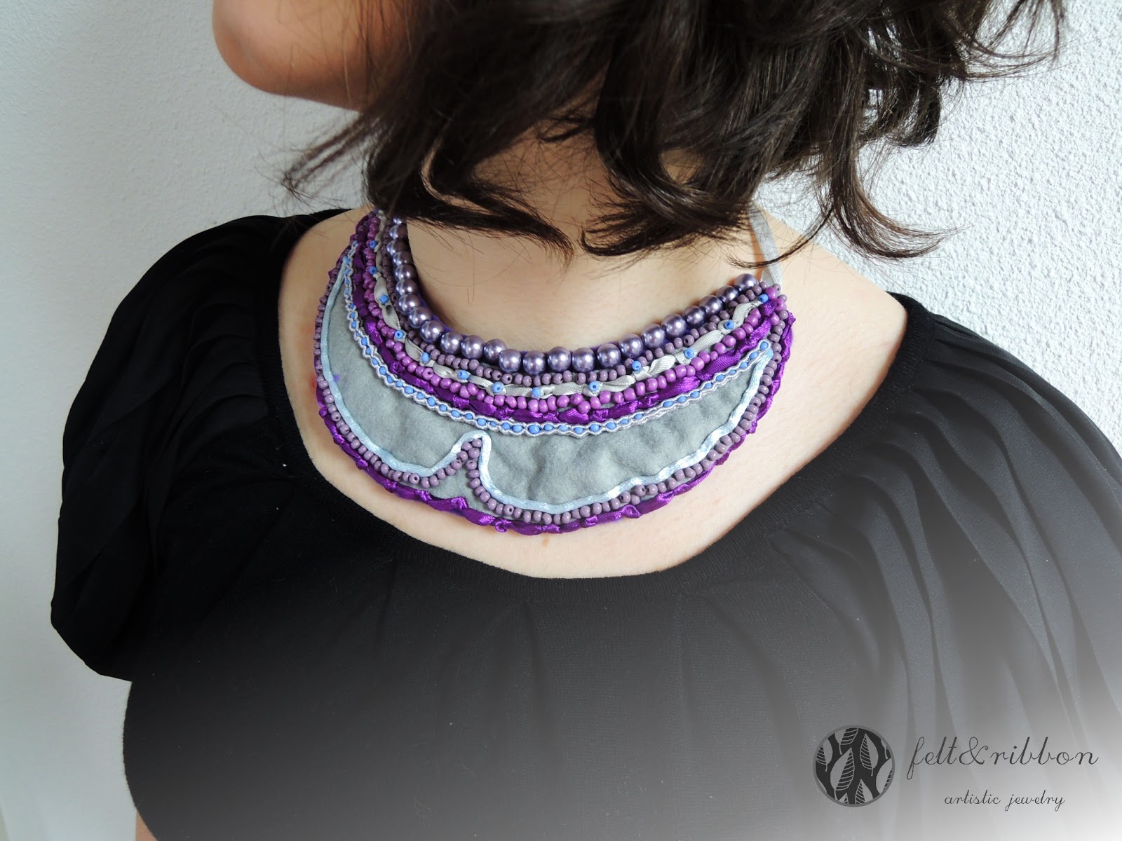 Ten weekend spędziłam na pracy nad nowym kołnierzykiem. Tym razem nie użyłam części męskiej koszuli jako bazy. Zdecydowałam się, że użyję filcu. Dało mi to pełną downość w wyborze kształtu. Poza filcem użyłam koralików, sznurków do soutache'u i wstążek. Jestem całkiem zadowolona z rezultatu.