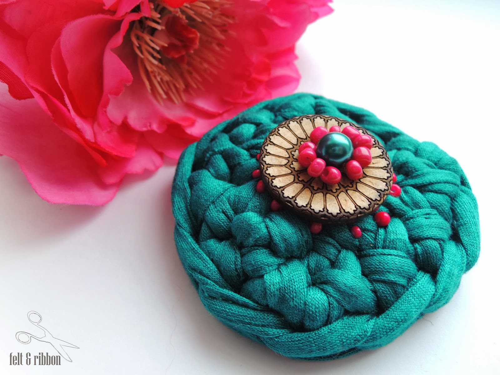 Today I have a crochet brooch for you. Zpagetti yarn is universal so it's also good for making brooches. Wooden button was bought in Poland, quite a long time ago. Finally I've found a perfect place for it. I hope you agree with me ;).