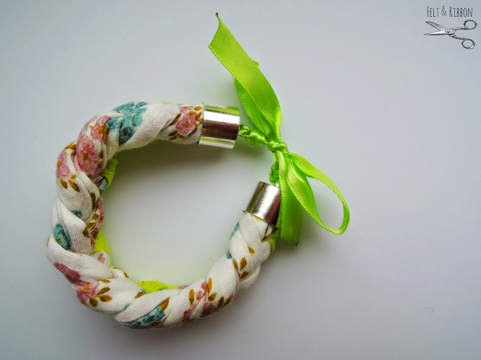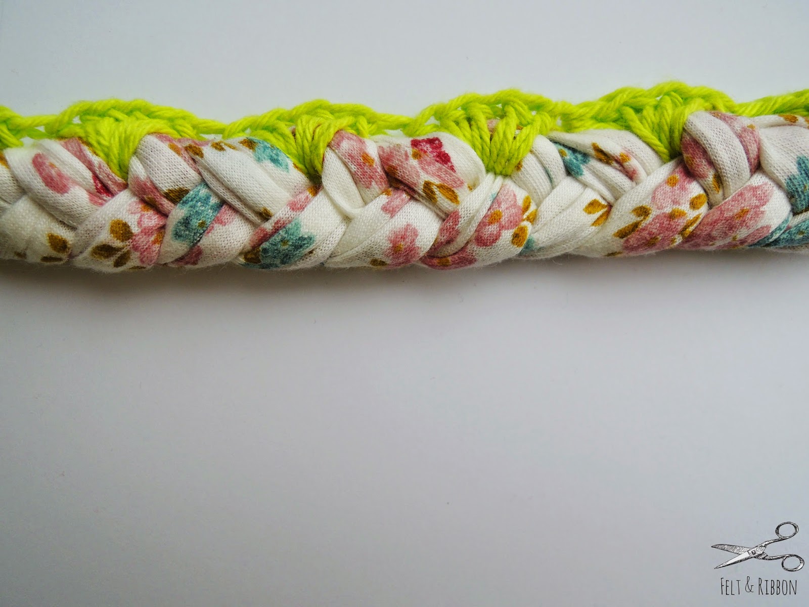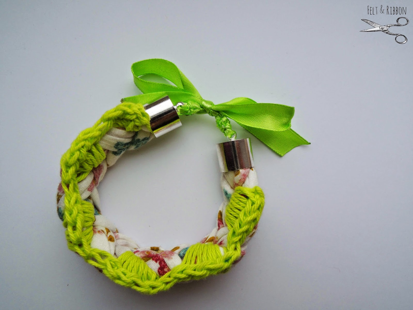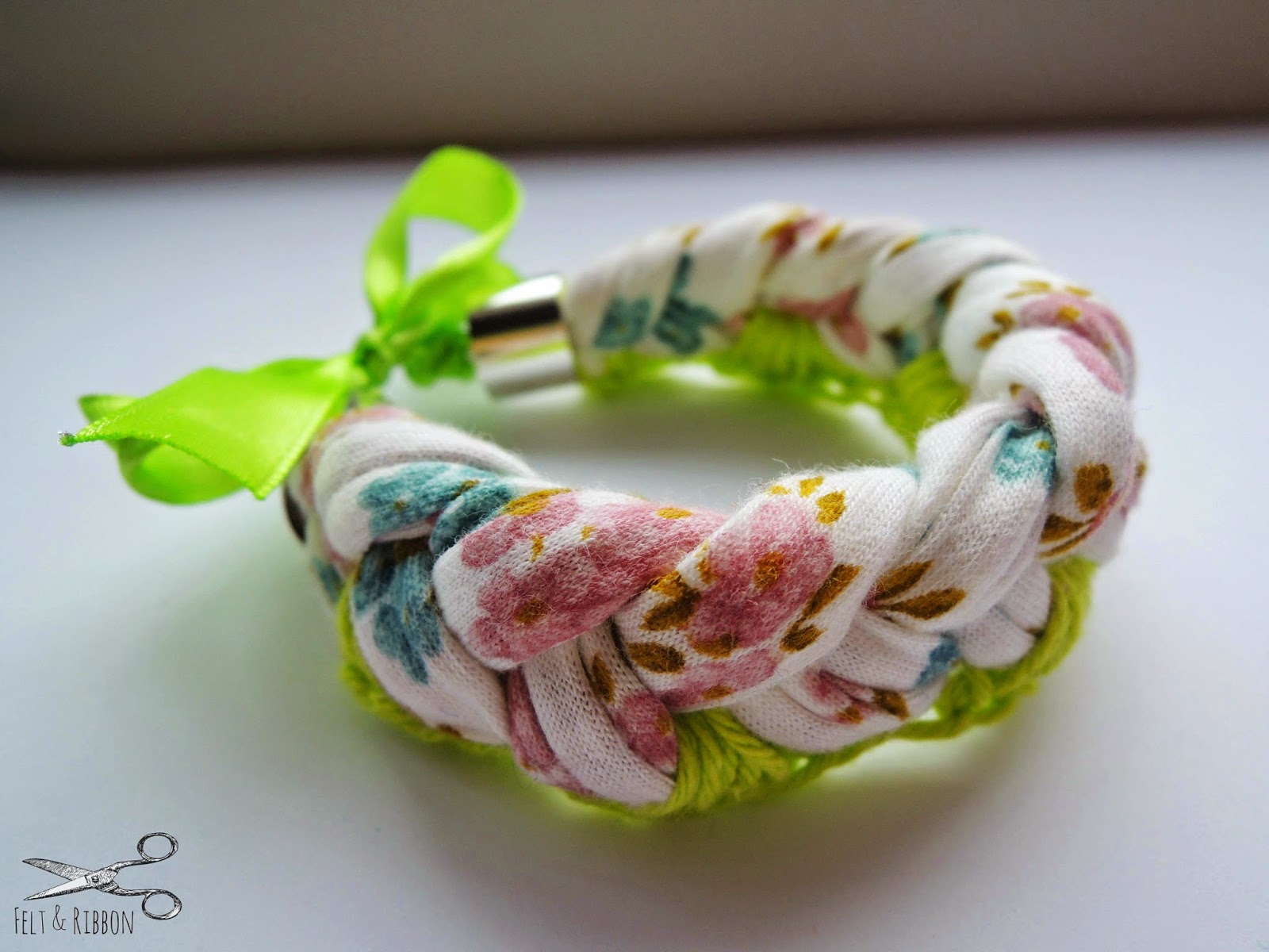 its turn. I used jersey yarn with floral pattern, cotton yarn and ribbon. That