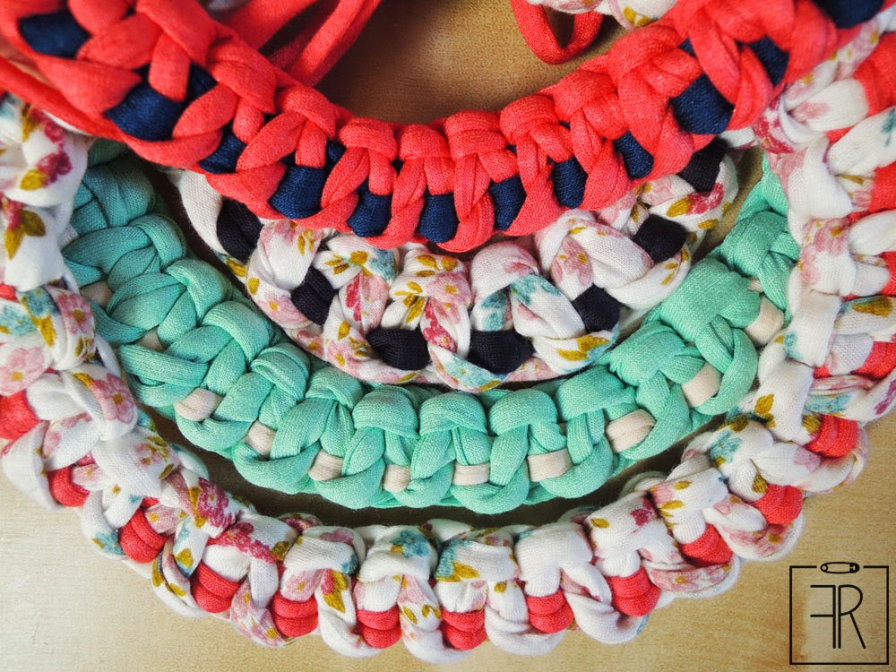 Before the Easter break I came with an idea of a new necklace. T-shirt yarn is a nice material - there are thousands of ways to braid it. I have made 12 necklaces. Of course there are no duplicates - each of them is unique. I will be selling them on the Spring Fair in Wageningen on April 24th. If you cannot attend they will be soon available on my DaWanda shop.